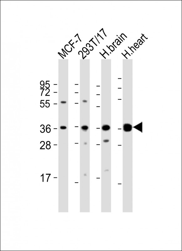 All lanes : Anti-BRCC3 Antibody (N-Term) at 1:2000 dilution Lane 1: MCF-7 whole cell lysate Lane 2: 293T/17 whole cell lysate Lane 3: human brain lysate Lane 4: human heart lysate Lysates/proteins at 20 μg per lane. Secondary Goat Anti-Rabbit IgG, (H+L), Peroxidase conjugated at 1/10000 dilution. Predicted band size : 36 kDa Blocking/Dilution buffer: 5% NFDM/TBST. |