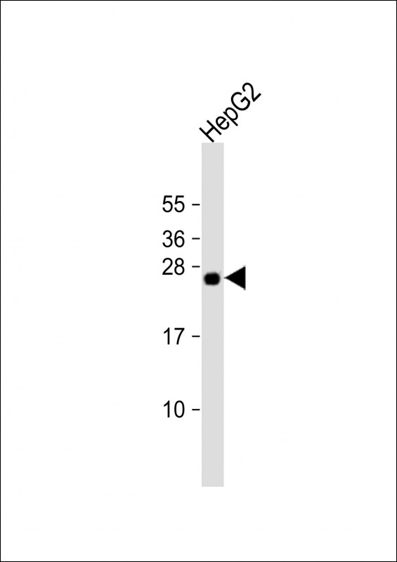 Anti-TMED4 Antibody (Center) at 1:2000 dilution + HepG2 whole cell lysate Lysates/proteins at 20 μg per lane. Secondary Goat Anti-Rabbit IgG, (H+L), Peroxidase conjugated at 1/10000 dilution. Predicted band size : 26 kDa Blocking/Dilution buffer: 5% NFDM/TBST. |
