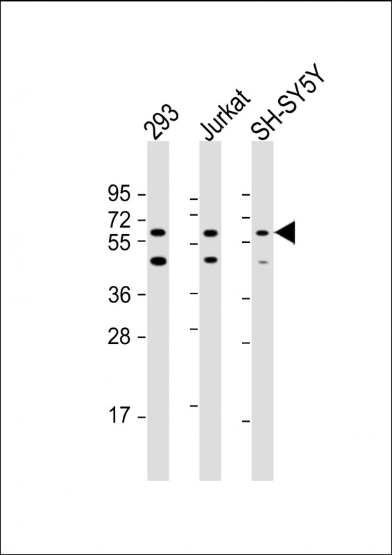 All lanes : Anti-HEXDC Antibody (N-Term) at 1:2000 dilution Lane 1: 293 whole cell lysate Lane 2: Jurkat whole cell lysate Lane 3: SH-SY5Y whole cell lysate Lysates/proteins at 20 μg per lane. Secondary Goat Anti-Rabbit IgG, (H+L), Peroxidase conjugated at 1/10000 dilution. Predicted band size : 54 kDa Blocking/Dilution buffer: 5% NFDM/TBST. |