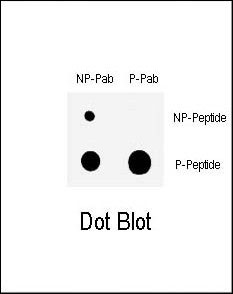 Dot blot analysis of anti-Phospho-CHK1-S317 Antibody (Cat. APR05115G) on nitrocellulose membrane. 50ng of Phospho-peptide or Non Phospho-peptide per dot were adsorbed. Antobodies working concentration was 0.5ug per ml.