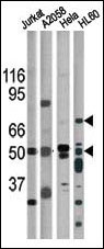The anti-Phospho-CHK1-S317 Pab (APR05115G) is used in Western blot for detection in, from left to right, Jurkat, A2058, Hela, and HL60 tissue lysates.