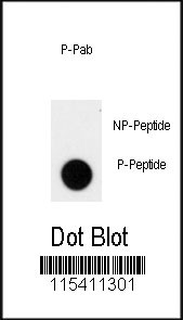 Dot blot analysis of anti-Phospho-ACK1-pY826 Phospho-specific Pab (Cat. APR05229G) on nitrocellulose membrane. 50ng of Phospho-peptide or Non Phospho-peptide per dot were adsorbed. Antibody working concentrations are 0.5ug per ml. |