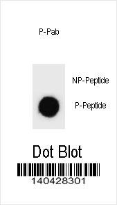 Dot blot analysis of Phospho-AMOT-S1041 Antibody Phospho-specific Pab (Cat. APR05240G) on nitrocellulose membrane. 50ng of Phospho-peptide or Non Phospho-peptide per dot were adsorbed. Antibody working concentrations are 0.6ug per ml. |