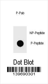 Dot blot analysis of Phospho-mouse BAD-S111 Antibody Phospho-specific Pab (Cat. APR05241G) on nitrocellulose membrane. 50ng of Phospho-peptide or Non Phospho-peptide per dot were adsorbed. Antibody working concentrations are 0.6ug per ml. |