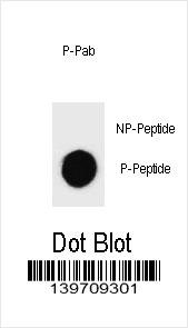 Dot blot analysis of Phospho-mouse CASP3-S26 Antibody Phospho-specific Pab (Cat. APR05248G) on nitrocellulose membrane. 50ng of Phospho-peptide or Non Phospho-peptide per dot were adsorbed. Antibody working concentrations are 0.6ug per ml. |