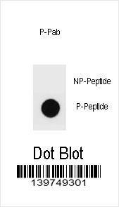 Dot blot analysis of Phospho-mouse ERBB2-S999 Antibody Phospho-specific Pab (Cat. APR05251G) on nitrocellulose membrane. 50ng of Phospho-peptide or Non Phospho-peptide per dot were adsorbed. Antibody working concentrations are 0.6ug per ml. |