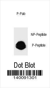 Dot blot analysis of Phospho-mouse ERBB2-Y1223 Antibody Phospho-specific Pab (Cat. APR05256G) on nitrocellulose membrane. 50ng of Phospho-peptide or Non Phospho-peptide per dot were adsorbed. Antibody working concentrations are 0.6ug per ml. |