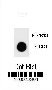 Dot blot analysis of Phospho-mouse ERBB2-Y1197 Antibody Phospho-specific Pab (Cat. APR05258G) on nitrocellulose membrane. 50ng of Phospho-peptide or Non Phospho-peptide per dot were adsorbed. Antibody working concentrations are 0.6ug per ml. |
