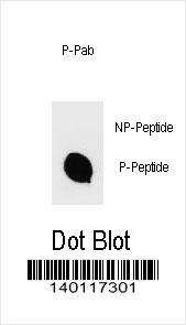 Dot blot analysis of Phospho-IKKB-S670 Antibody Phospho-specific Pab (Cat. APR05263G) on nitrocellulose membrane. 50ng of Phospho-peptide or Non Phospho-peptide per dot were adsorbed. Antibody working concentrations are 0.6ug per ml. |