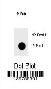 Dot blot analysis of Phospho-IKKB-S692 Antibody Phospho-specific Pab (Cat. APR05267G) on nitrocellulose membrane. 50ng of Phospho-peptide or Non Phospho-peptide per dot were adsorbed. Antibody working concentrations are 0.6ug per ml. |