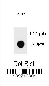 Dot blot analysis of Phospho-KIT-S821 Antibody Phospho-specific Pab (Cat. APR05273G) on nitrocellulose membrane. 50ng of Phospho-peptide or Non Phospho-peptide per dot were adsorbed. Antibody working concentrations are 0.6ug per ml. |