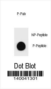 Dot blot analysis of Phospho-KIT-T354 Antibody Phospho-specific Pab (Cat. APR05275G) on nitrocellulose membrane. 50ng of Phospho-peptide or Non Phospho-peptide per dot were adsorbed. Antibody working concentrations are 0.6ug per ml. |