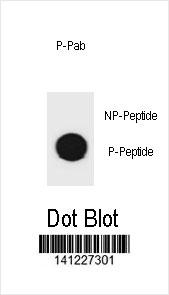 Dot blot analysis of mouse TSC1 Antibody (Phospho S1130) Phospho-specific Pab (Cat. APR05298G) on nitrocellulose membrane. 50ng of Phospho-peptide or Non Phospho-peptide per dot were adsorbed. Antibody working concentrations are 0.6ug per ml. |