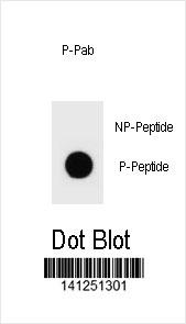 Dot blot analysis of mouse TSC2 Antibody (Phospho S1096) Phospho-specific Pab (Cat. APR05308G) on nitrocellulose membrane. 50ng of Phospho-peptide or Non Phospho-peptide per dot were adsorbed. Antibody working concentrations are 0.6ug per ml. |