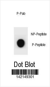 Dot blot analysis of CCNB2 Antibody (Phospho S392) Phospho-specific Pab (Cat. APR05319G) on nitrocellulose membrane. 50ng of Phospho-peptide or Non Phospho-peptide per dot were adsorbed. Antibody working concentrations are 0.6ug per ml. |