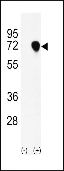 Western blot analysis of NASP (arrow) using rabbit polyclonal NASP Antibody (N-term) (Cat. APR05360G). 293 cell lysates (2 ug/lane) either nontransfected (Lane 1) or transiently transfected with the NASP gene (Lane 2) .
