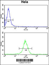 NAT13 Antibody (C-term) (Cat.APR05420G) flow cytometry analysis of Hela cells (bottom histogram) compared to a negative control cell (top histogram). FITC-conjugated goat-anti-rabbit secondary antibodies were used for the analysis. |