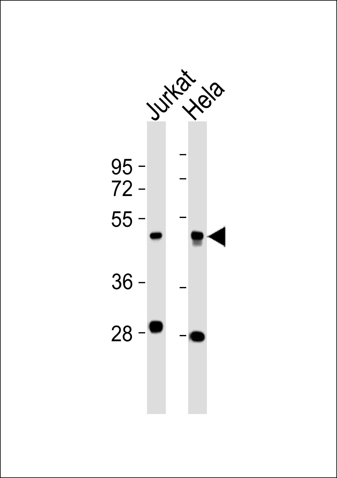 All lanes : Anti-ARP3 Antibody at 1:1000 dilution Lane 1: Jurkat whole cell lysates Lane 2: Hela whole cell lysates Lysates/proteins at 20 μg per lane. Secondary Goat Anti-Rabbit IgG, (H+L),Peroxidase conjugated at 1/10000 dilution Predicted band size : 47 kDa Blocking/Dilution buffer: 5% NFDM/TBST. |