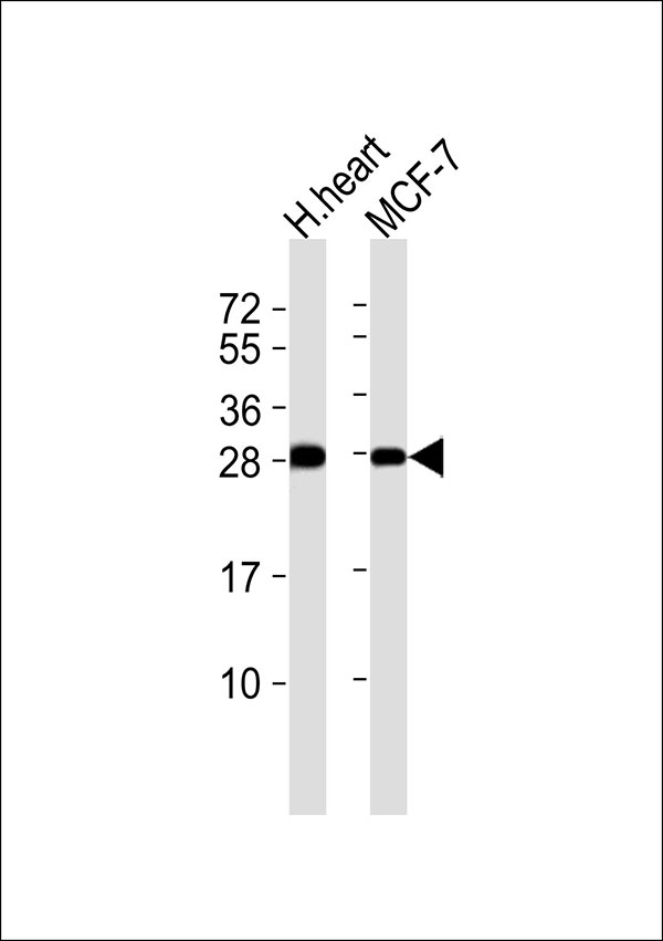 All lanes : Anti-TIMP4 Antibody at 1:1000 dilution Lane 1: human heart lysates Lane 2: MCF-7 whole cell lysates Lysates/proteins at 20 μg per lane. Secondary Goat Anti-Rabbit IgG, (H+L),Peroxidase conjugated at 1/10000 dilution Predicted band size : 26 kDa Blocking/Dilution buffer: 5% NFDM/TBST. |