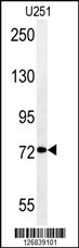 DEPDC1 Antibody (N-term)(Cat. APR05646G) western blot analysis in U251 cell line lysates (35ug/lane).This demonstrates the DEPDC1 antibody detected the DEPDC1 protein (arrow).