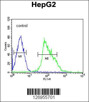 USP17 Antibody (C-term) (Cat. APR05653G) flow cytometric analysis of HepG2 cells (right histogram) compared to a negative control cell (left histogram).FITC-conjugated goat-anti-rabbit secondary antibodies were used for the analysis. |
