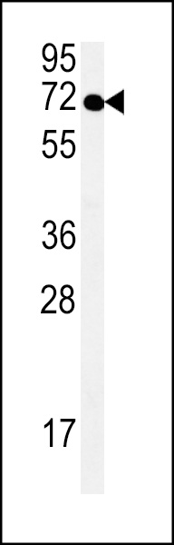 SPT13 Antibody (Center) (Cat.APR05654G) western blot analysis in Hela cell line lysates (35ug/lane).This demonstrates the SPT13 antibody detected the SPT13 protein (arrow).