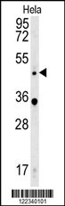 WNT5A Antibody (Center) (Cat. APR05668G) western blot analysis in Hela cell line lysates (35ug/lane).This demonstrates the WNT5A antibody detected the WNT5A protein (arrow). |