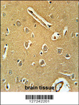 RNF208 Antibody (Center) (Cat. APR05673G) immunohistochemistry analysis in formalin fixed and paraffin embedded human brain tissue followed by peroxidase conjugation of the secondary antibody and DAB staining. This data demonstrates the use of the RNF208 Antibody (Center) for immunohistochemistry. Clinical relevance has not been evaluated.