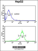 RNF208 Antibody (Center) (Cat. APR05673G) flow cytometric analysis of HepG2 cells (bottom histogram) compared to a negative control cell (top histogram).FITC-conjugated goat-anti-rabbit secondary antibodies were used for the analysis. |