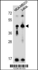 KIR2DL2 Antibody (C-Term) (Cat. APR05675G) western blot analysis in MDA-MB231,Jurkat cell line lysates (35ug/lane).This demonstrates the KIR2DL2 antibody detected the KIR2DL2 protein (arrow).