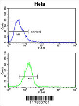 DPP8 Antibody (N-term) (Cat. APR05756G) flow cytometric analysis of Hela cells (bottom histogram) compared to a negative control cell (top histogram).FITC-conjugated goat-anti-rabbit secondary antibodies were used for the analysis. |