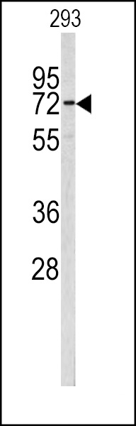 Western blot analysis of CEA antibody (Center) (Cat. APR05758G) in 293 cell line lysates (35ug/lane). CEA (arrow) was detected using the purified Pab.