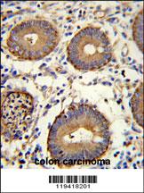 CEA Antibody (Center) (Cat. APR05758G) immunohistochemistry analysis in formalin fixed and paraffin embedded human colon carcinoma followed by peroxidase conjugation of the secondary antibody and DAB staining. This data demonstrates the use of the CEA Antibody (Center) for immunohistochemistry. Clinical relevance has not been evaluated.