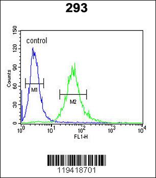 CEA Antibody (Center) (Cat. APR05758G) flow cytometric analysis of 293 cells (right histogram) compared to a negative control cell (left histogram).FITC-conjugated goat-anti-rabbit secondary antibodies were used for the analysis. |