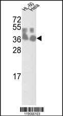 Western blot analysis of CLNS1A Antibody (Center) (Cat. APR05763G) in HL-60 and Hela cell line lysates (35ug/lane). CLNS1A (arrow) was detected using the purified Pab.