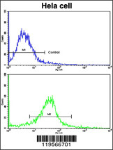 Flow cytometric analysis of hela cells using CLNS1A Antibody (Center)(bottom histogram) compared to a negative control cell (top histogram). FITC-conjugated goat-anti-rabbit secondary antibodies were used for the analysis. |
