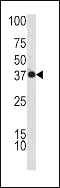 Western blot analysis of CFHL1 antibody (C-term) (Cat. APR05775G) in K562 cell line lysates (35ug/lane). CFHL1 (arrow) was detected using the purified Pab.