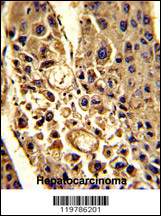 Formalin-fixed and paraffin-embedded human hepatocarcinoma with CFHL1 Antibody (C-term), which was peroxidase-conjugated to the secondary antibody, followed by DAB staining. This data demonstrates the use of this antibody for immunohistochemistry; clinical relevance has not been evaluated.