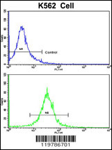 Flow cytometric analysis of K562 cells using CFHL1 Antibody (C-term)(bottom histogram) compared to a negative control cell (top histogram). FITC-conjugated goat-anti-rabbit secondary antibodies were used for the analysis. |