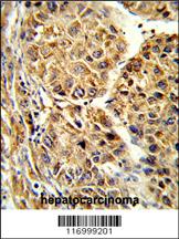 Formalin-fixed and paraffin-embedded human hepatocarcinoma reacted with CYP2C19 Antibody (N-term),which was peroxidase-conjugated to the secondary antibody, followed by DAB staining. This data demonstrates the use of this antibody for immunohistochemistry; clinical relevance has not been evaluated. |