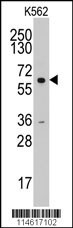 Western blot analysis of anti-CCNA2(N-term) Pab (Cat.APR05876G) in K562 cell line lysates (35ug/lane). CCNA2(arrow) was detected using the purified Pab.