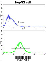 Flow cytometric analysis of HepG2 cells using Cyclin A (CCNA2) Antibody (N-term)(bottom histogram) compared to a negative control cell (top histogram). FITC-conjugated goat-anti-rabbit secondary antibodies were used for the analysis. |