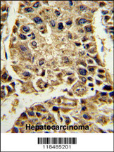 Formalin-fixed and paraffin-embedded human hepatocarcinoma reacted with SERPINA4 Antibody (C-term), which was peroxidase-conjugated to the secondary antibody, followed by DAB staining. This data demonstrates the use of this antibody for immunohistochemistry; clinical relevance has not been evaluated.