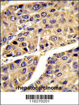 Formalin-fixed and paraffin-embedded human hepatocarcinoma reacted with IGFALS Antibody (Center), which was peroxidase-conjugated to the secondary antibody, followed by DAB staining. This data demonstrates the use of this antibody for immunohistochemistry; clinical relevance has not been evaluated.