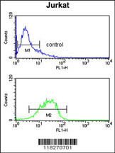 IGFALS Antibody (Center) (Cat. APR05915G) flow cytometry analysis of Jurkat cells (bottom histogram) compared to a negative control cell (top histogram).FITC-conjugated goat-anti-rabbit secondary antibodies were used for the analysis. |