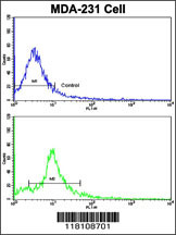 Flow cytometric analysis of MDA-231 cells using NUP62 Antibody (C-term E507)(bottom histogram) compared to a negative control cell (top histogram). FITC-conjugated goat-anti-rabbit secondary antibodies were used for the analysis. |