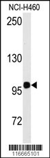 Western blot analysis of anti-HIPK2 Antibody (Y361) (Cat.APR05928G) in NCI-H460 cell line lysates (35ug/lane). HIPK2 (arrow) was detected using the purified Pab. |