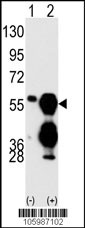 Western blot analysis of PPM1F (arrow) using PPM1F Antibody (C-term) (Cat.APR06086G). 293 cell lysates (2 ug/lane) either nontransfected (Lane 1) or transiently transfected with the PPM1F gene (Lane 2) (Origene Technologies).