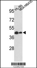 Western blot analysis of GSDMB Antibody (Center) (Cat. APR06095G) in HL-60, MDA-MB435 cell line lysates (35ug/lane). GSDMB (arrow) was detected using the purified Pab. |