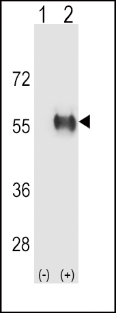 Western blot analysis of ALDH3B1 (arrow) using rabbit polyclonal ALDH3B1 Antibody (Center) (Cat. APR06117G). 293 cell lysates (2 ug/lane) either nontransfected (Lane 1) or transiently transfected (Lane 2) with the ALDH3B1 gene. |